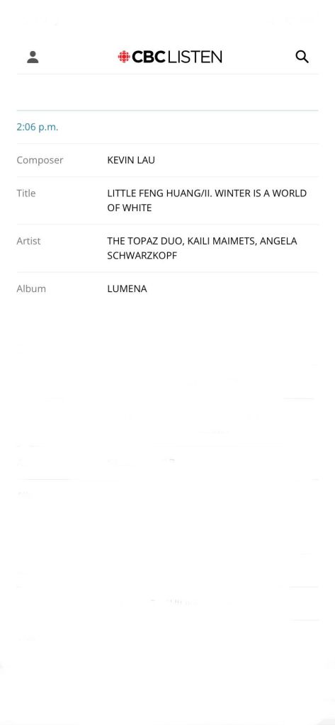 Our recording of “Winter is a World of White” by Kevin Lau was played on CBC radio on Friday April 22! Thanks so much Tom Allen for including us on About Time.